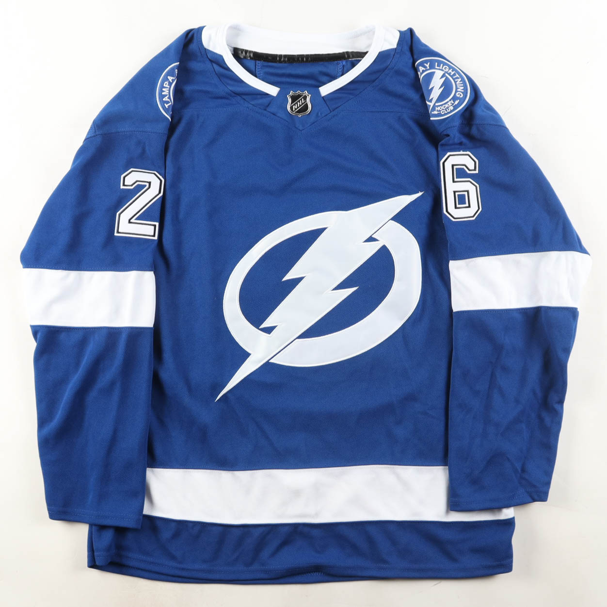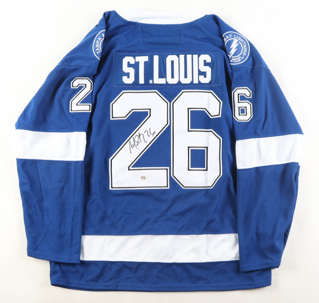 Custom jersey with everything sewn on, size XL. Hand-signed by Martin St. Louis (HOF). Please note, there is a stain on the reverse number.