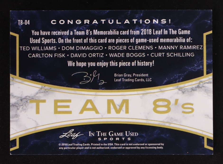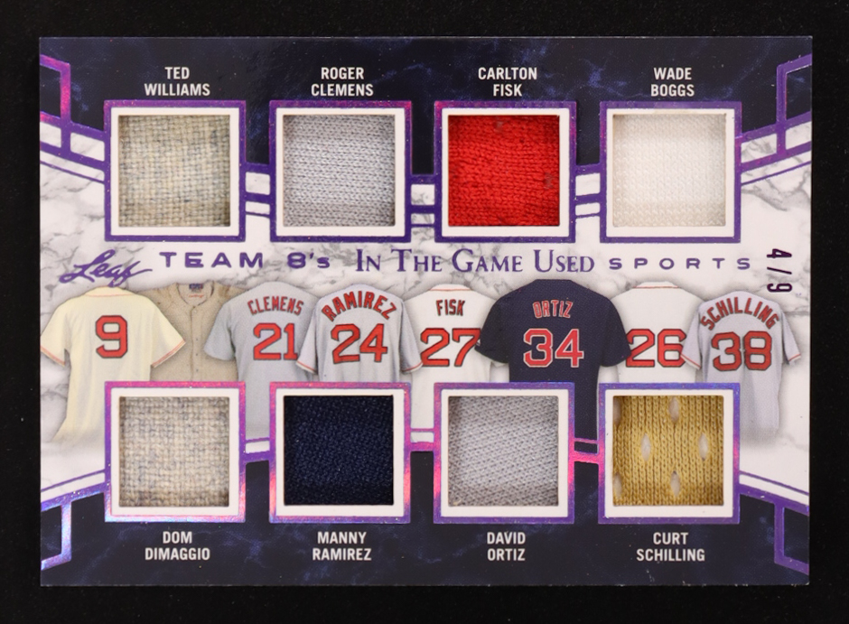 Ted Williams / Dom DiMaggio / Roger Clemens / Manny Ramirez / Carlton Fisk / David Ortiz / Wade Boggs / Curt Schilling 2018 ITG Used Sports Team 8s Purple #T804 #4/9