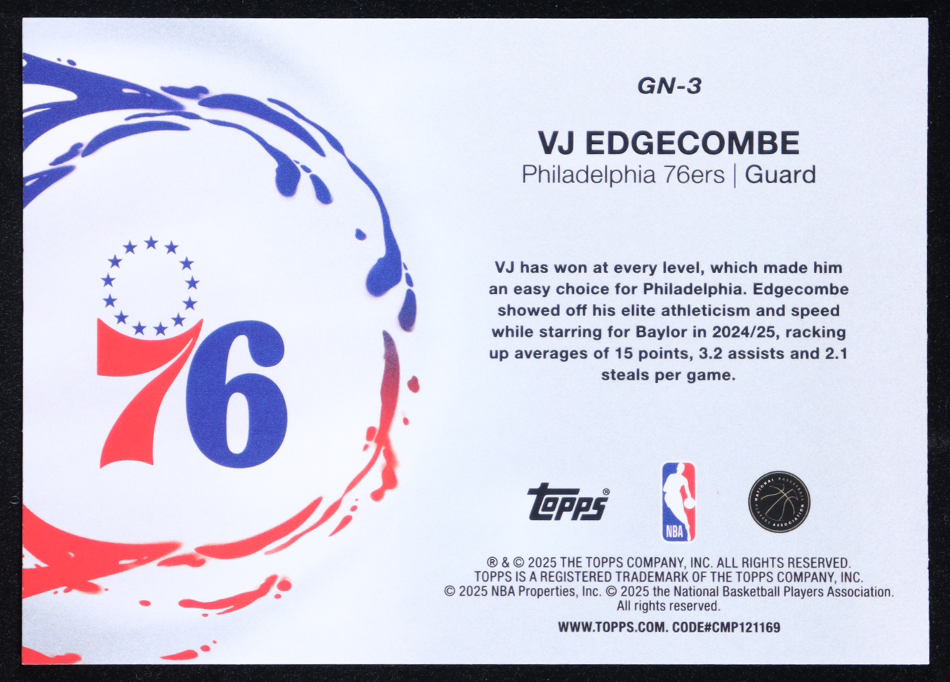 VJ Edgecombe 2025-26 Topps Generation Now Purple Holo Foil #GN3 RC #218/250