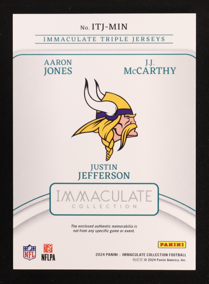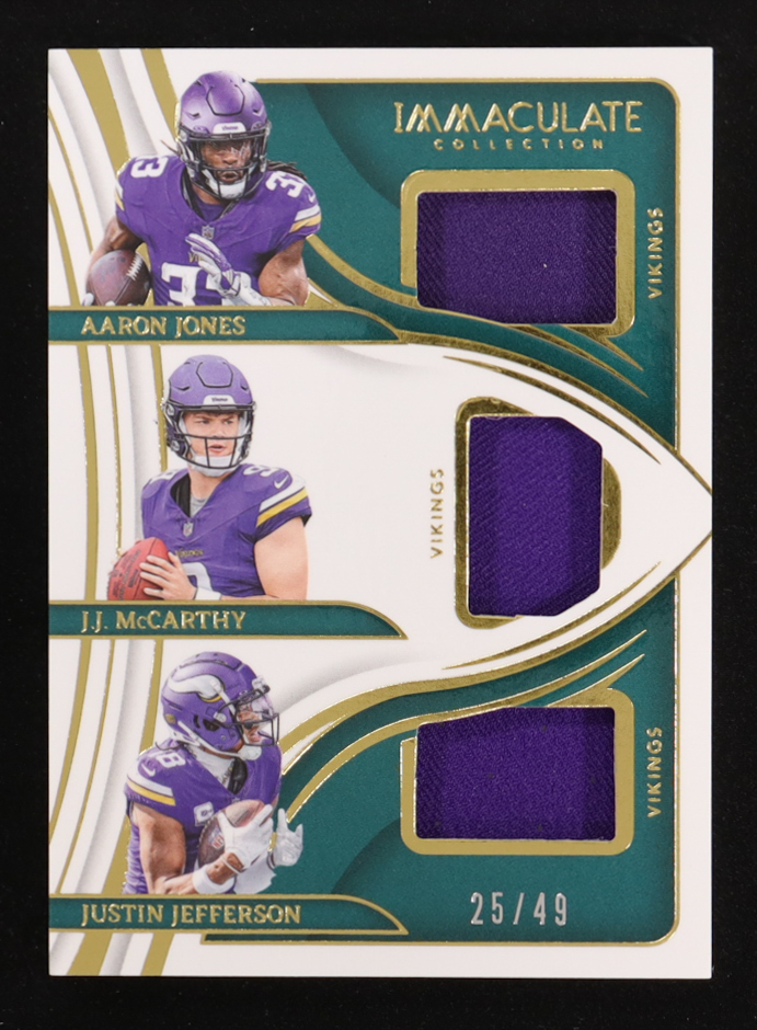 JJ McCarthy / Justin Jefferson / Aaron Jones 2024 Immaculate Collection Immaculate Triple Jerseys #13 #25/49