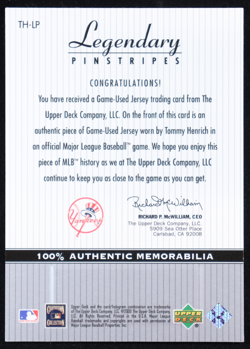 Tommy Henrich 2000 Upper Deck Yankees Legends Legendary Pinstripes #THLP