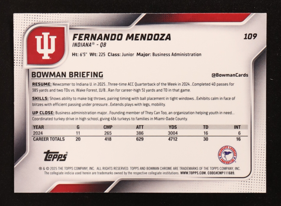 Fernando Mendoza 2025 Bowman Chrome University Aqua Refractors #109 RC #137/325