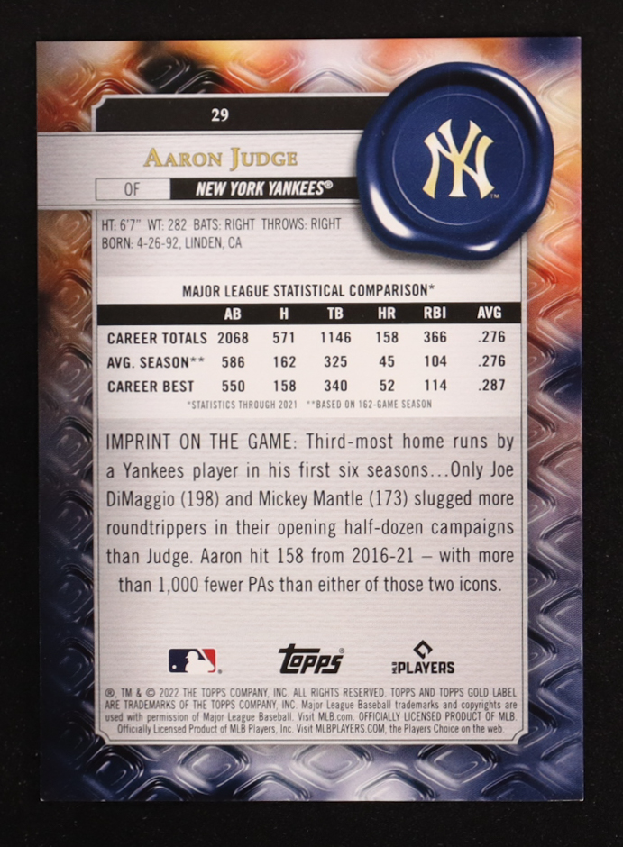Aaron Judge 2022 Topps Gold Label Class 3 Purple #29 #25/35