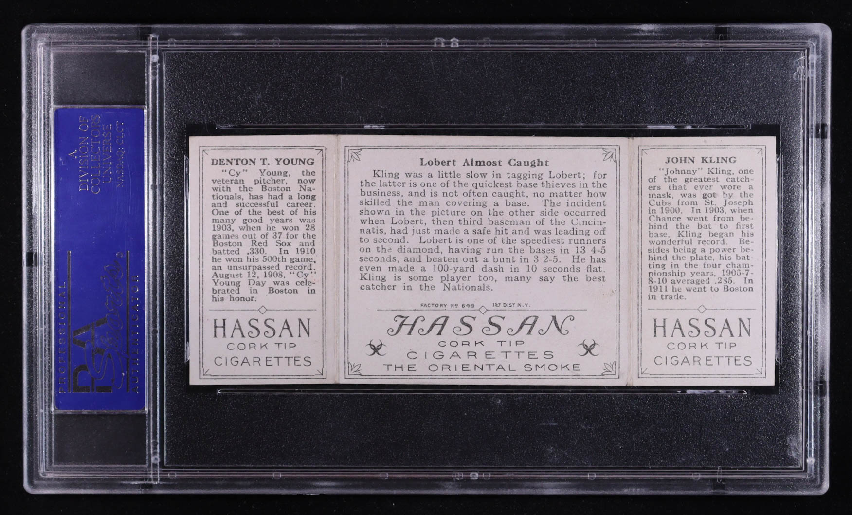 Johnny Kling / Cy Young 1912 Hassan Triple Folders T202 #91 / Lobert Almost Caught (PSA 8) (OC)