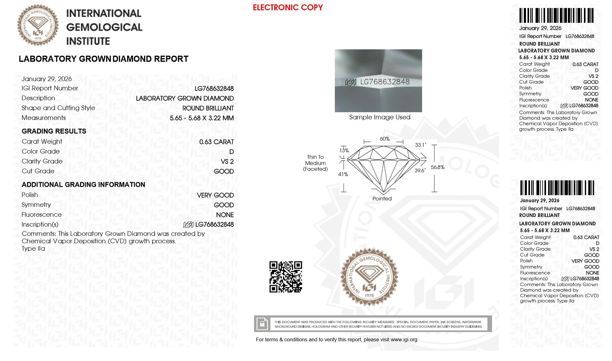 .63 Carats Lab Grown Diamond Loose D, VS2 | IGI Cert