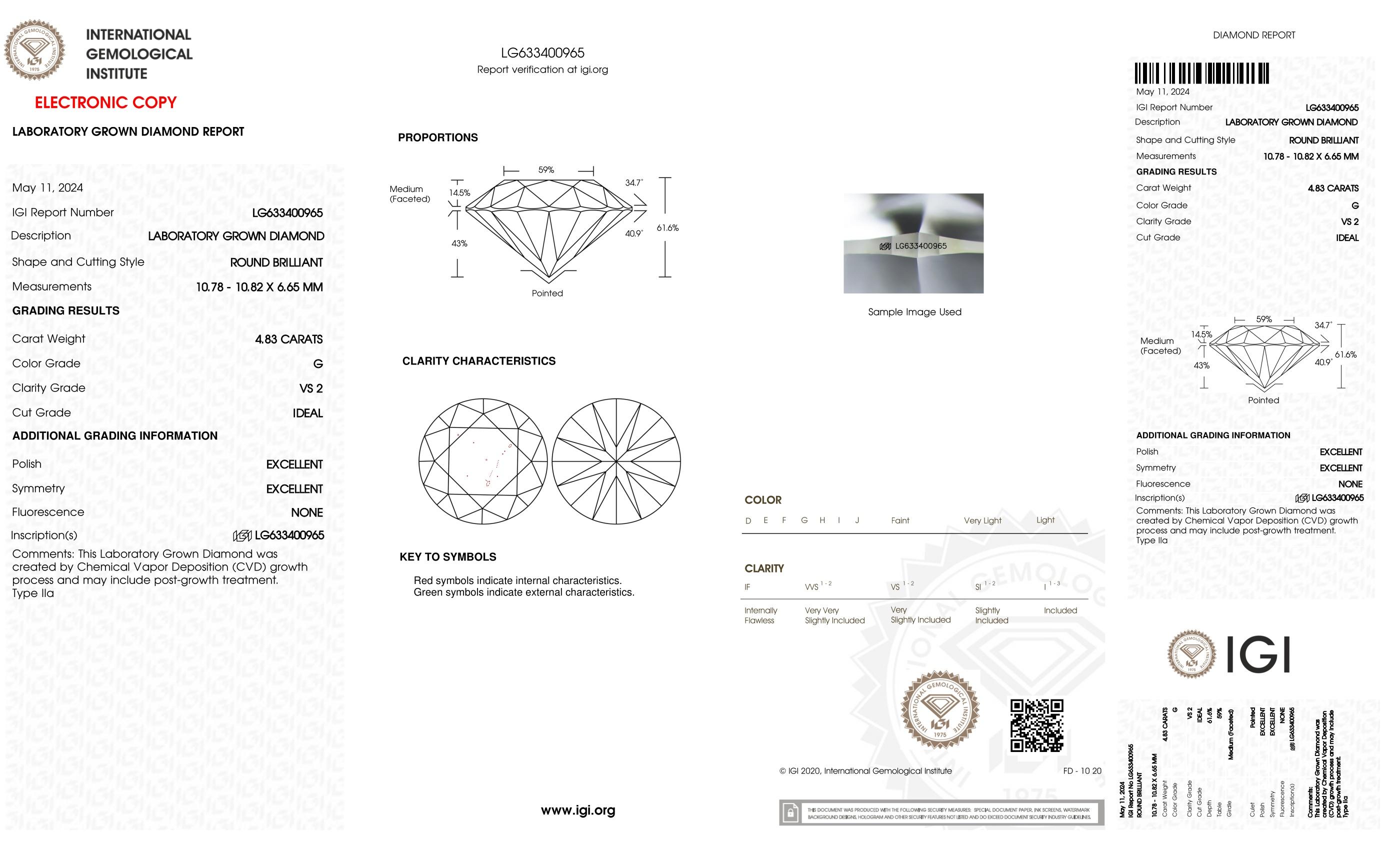 Pair of round brilliant laboratory grown diamond stud earrings set in platinum mountings. These impressive diamond studs feature two large round brilliant cut laboratory grown diamonds with a combined weight of approximately 9.64 carats. The diamonds display a bright G color and VS2 clarity grade, offering strong brilliance and classic round diamond sparkle. Each diamond is laser inscribed on the girdle and corresponds with its individual IGI Laboratory Grown Diamond Report verifying the grading characteristics. The diamonds are securely set in platinum stud earring mountings designed to highlight the size and brilliance of the stones. A UGL appraisal report accompanies the earrings documenting the item and providing an estimated retail replacement value for insurance purposes.