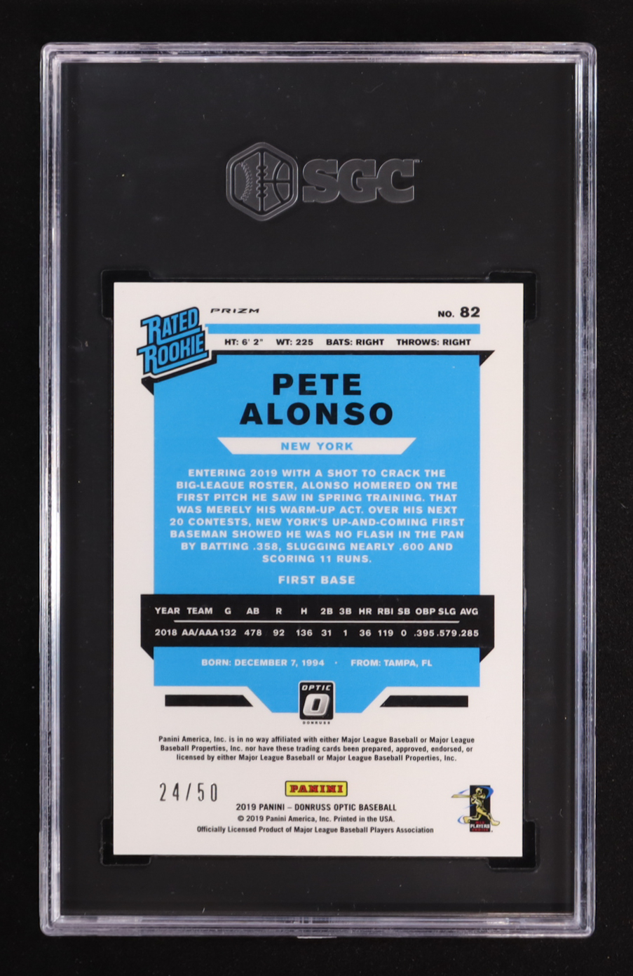 Pete Alonso 2019 Donruss Optic Carolina Blue #82 #24/50 RC (SGC 9)