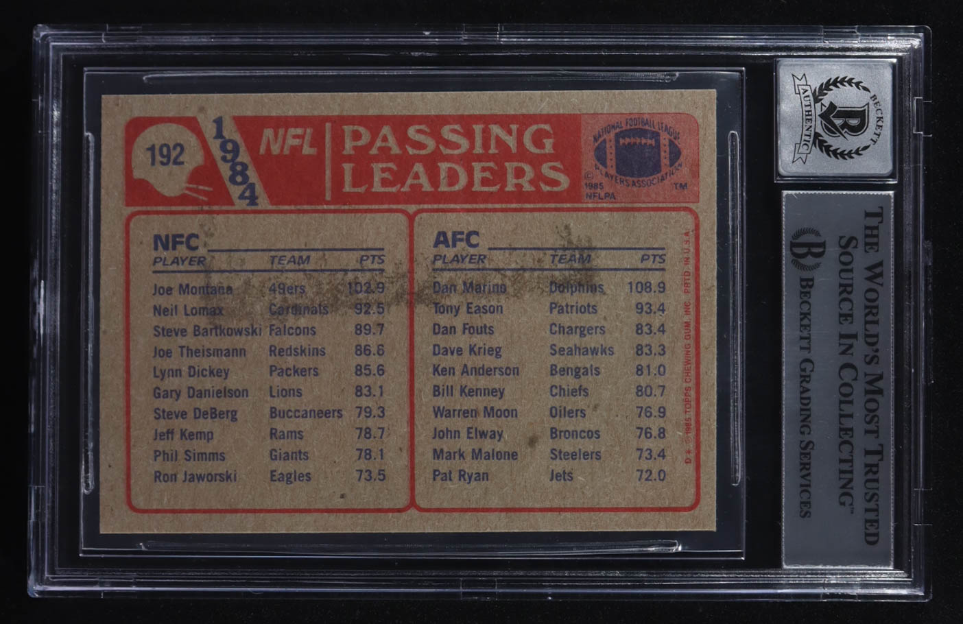 Dan Marino / Joe Montana Signed 1985 Topps #192 Passing Leaders (BGS Encapsulated)