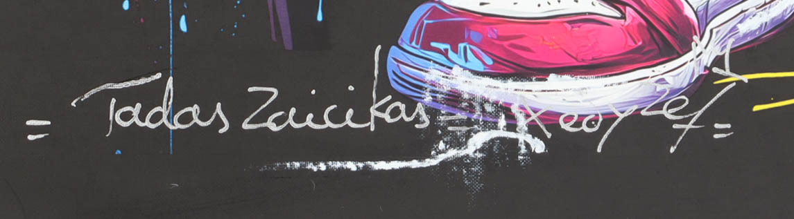 This original painting of acrylic, enamel and spray paint on canvas measures 19" x 26" in size and has been hand-signed and titled by the artist, Tadas Zaicikas (TedyZet).