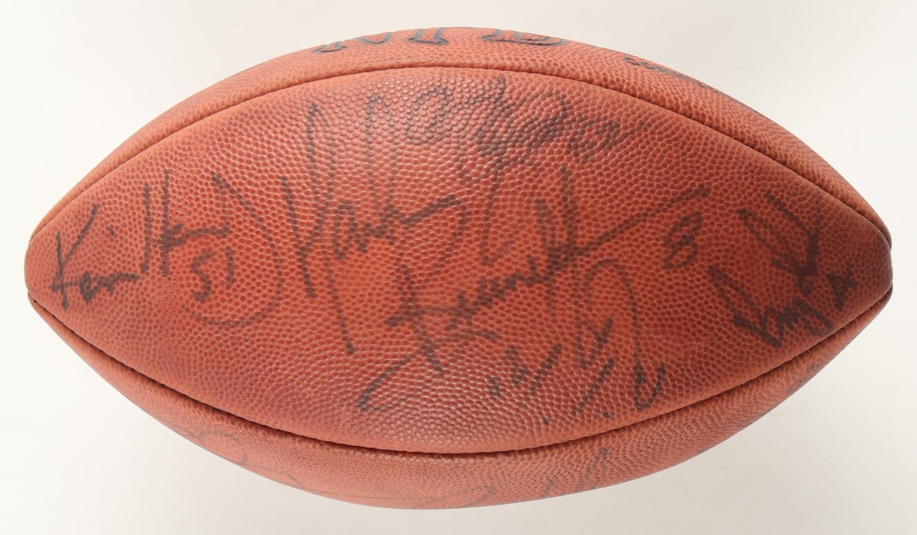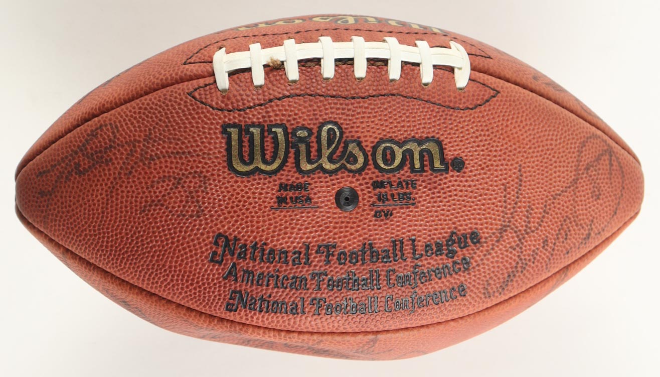 Wilson official NFL football hand-signed by (12) members of the 1998 Jacksonville Jaguars including: Fred Taylor, Keenan McCardell, Renaldo Wynn, Donovan Darius, Tony Boselli, Kevin Hardy, Mark Brunell, Brent Boyer, Bryan Barker, Aaron Beasley, Jimmy Smith, and Seth Payne. Please note the ball does not fully hold air, see photos for details on condition of the item.