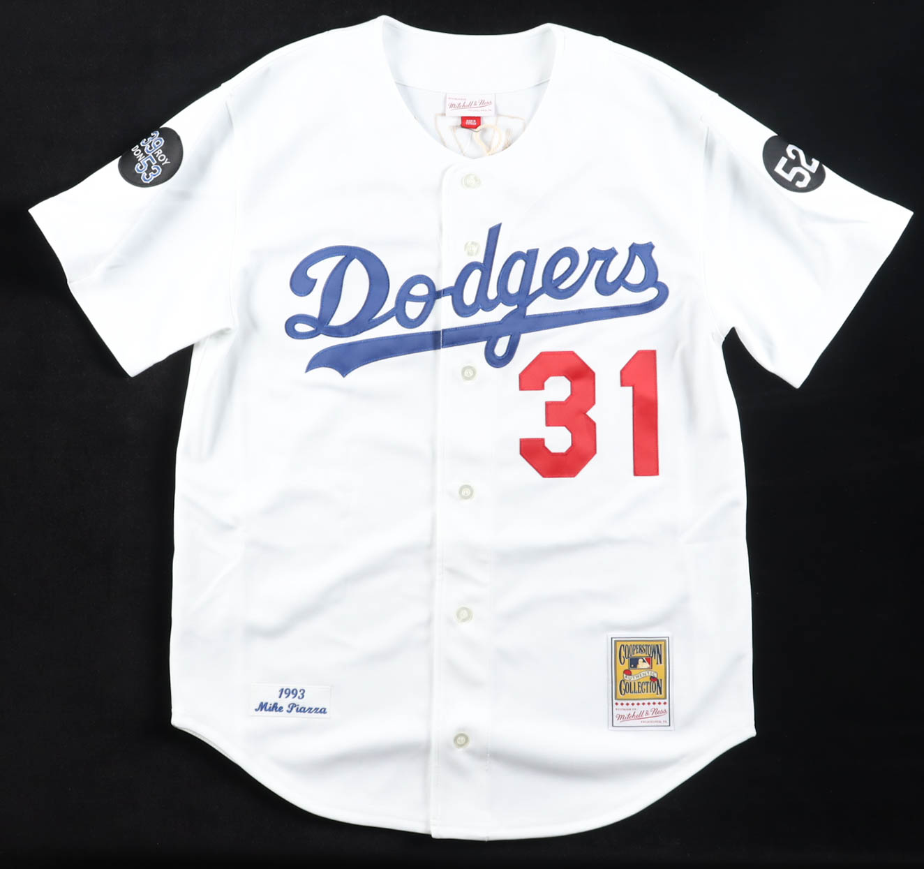 Mitchell & Ness authentic jersey with everything sewn on, size 44. Hand-signed by Mike Piazza (Los Angeles Dodgers, HOF).