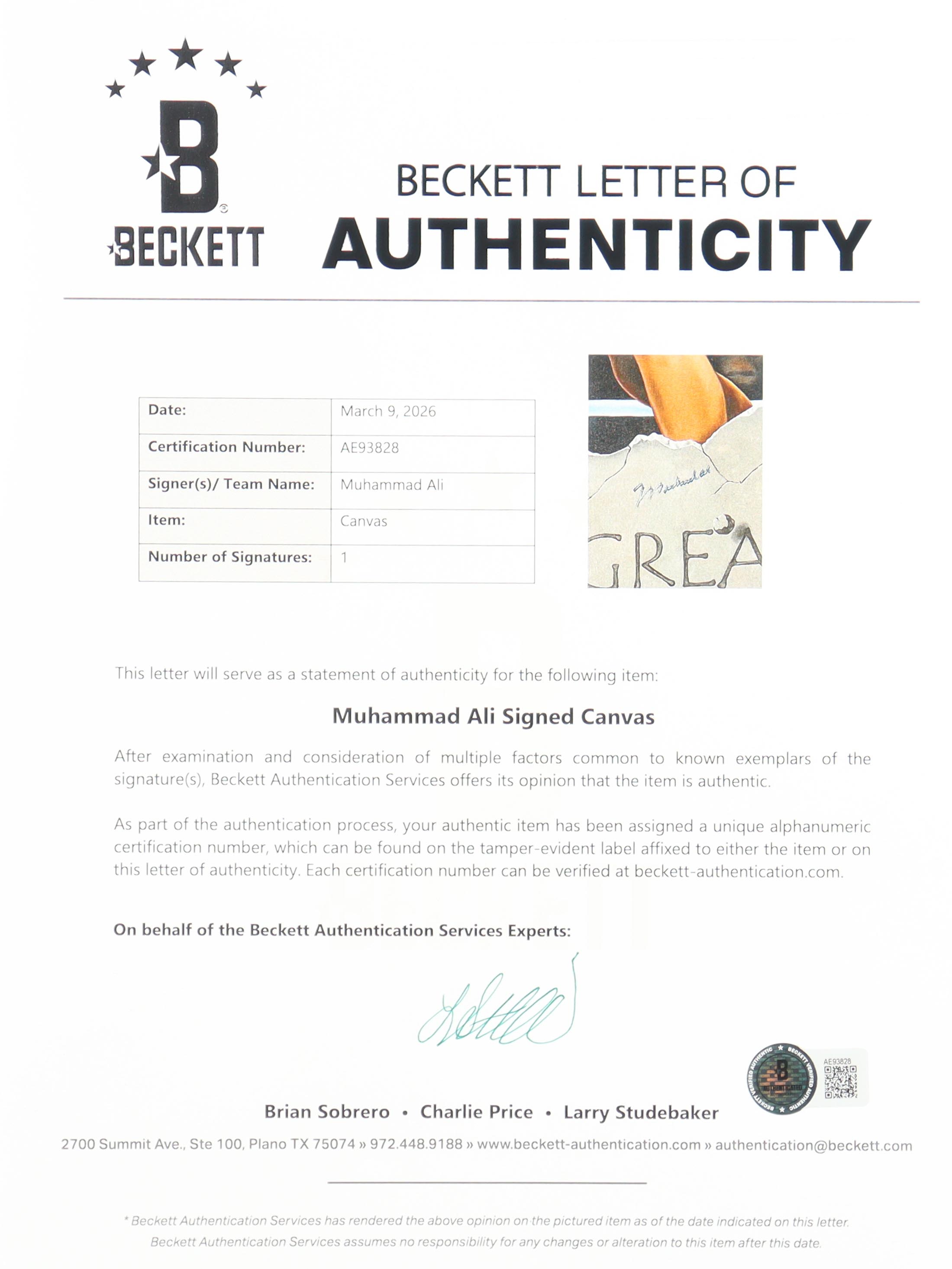 Canvas measures 30" x 38" and has been hand-signed by Muhammad Ali (D. 2016, HOF) and the artist Steve Parsons. Canvas is limited edition # AAC 6 / 10.