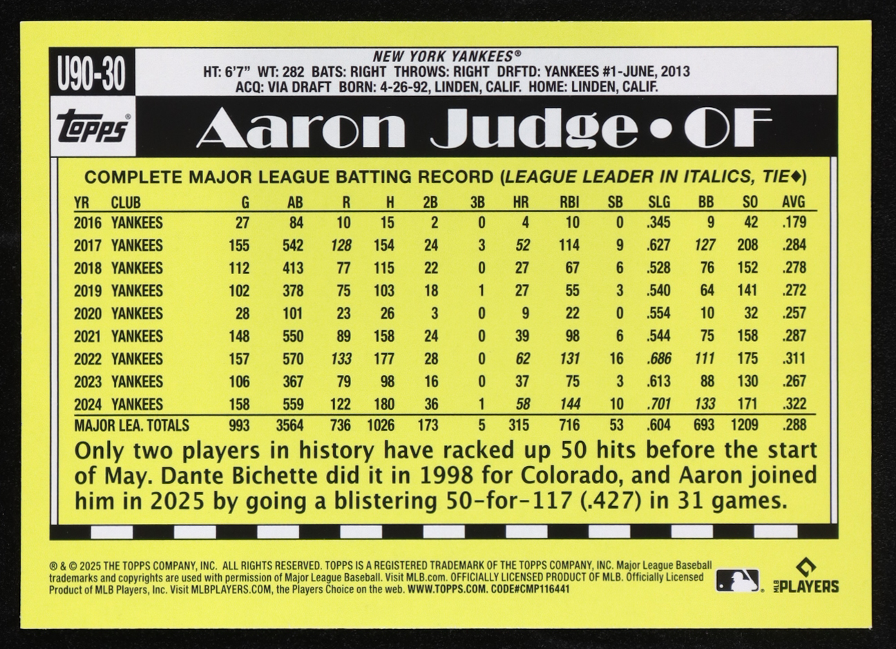 Aaron Judge 2025 Topps 35th Anniversary 1990 #U90-30