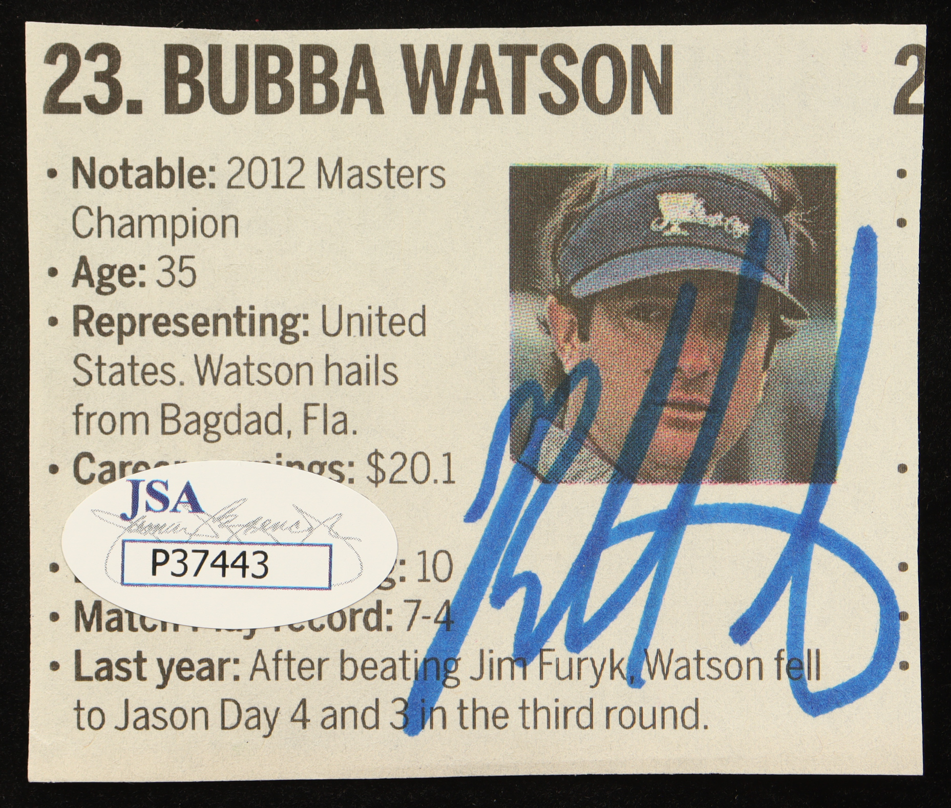 Newspaper cut measures 2.5" x 3" in size. Hand-signed by Bubba Watson.