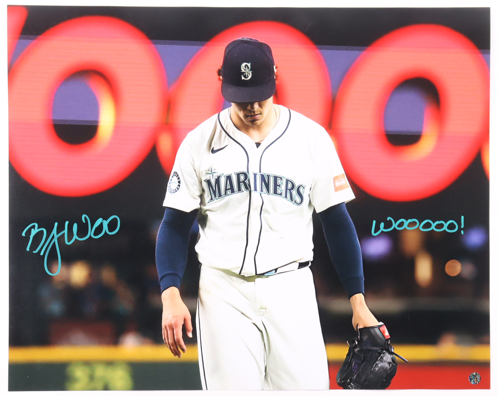 Photo measures 16" x 20" in size and has been hand-signed and inscribed by Bryan Woo (Seattle Mariners).
