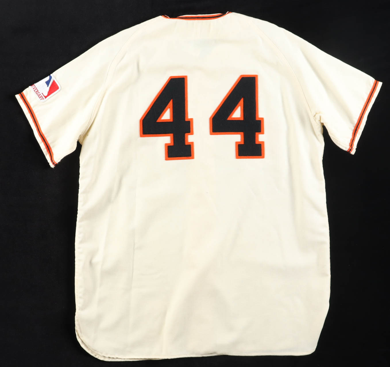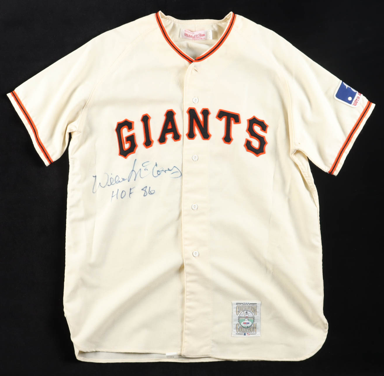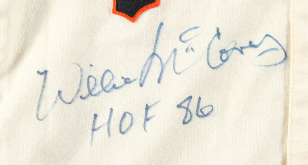 Majestic authentic jersey with everything sewn on, size L. Hand-signed and inscribed by Willie McCovey (D. 2018, San Francisco Giants, HOF).