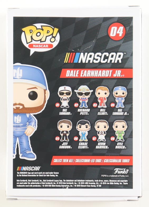 Figure measures approximately 4" tall and comes in the original packaging. Hand-signed by Dale Earnhardt Jr. (HOF). Please note there is a dent on the back of the packaging.