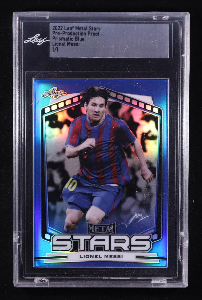 Lionel Messi 2022 Leaf Metal Stars Pre-Production Proof Prismatic Blue #NNO 1/1 (Leaf)
