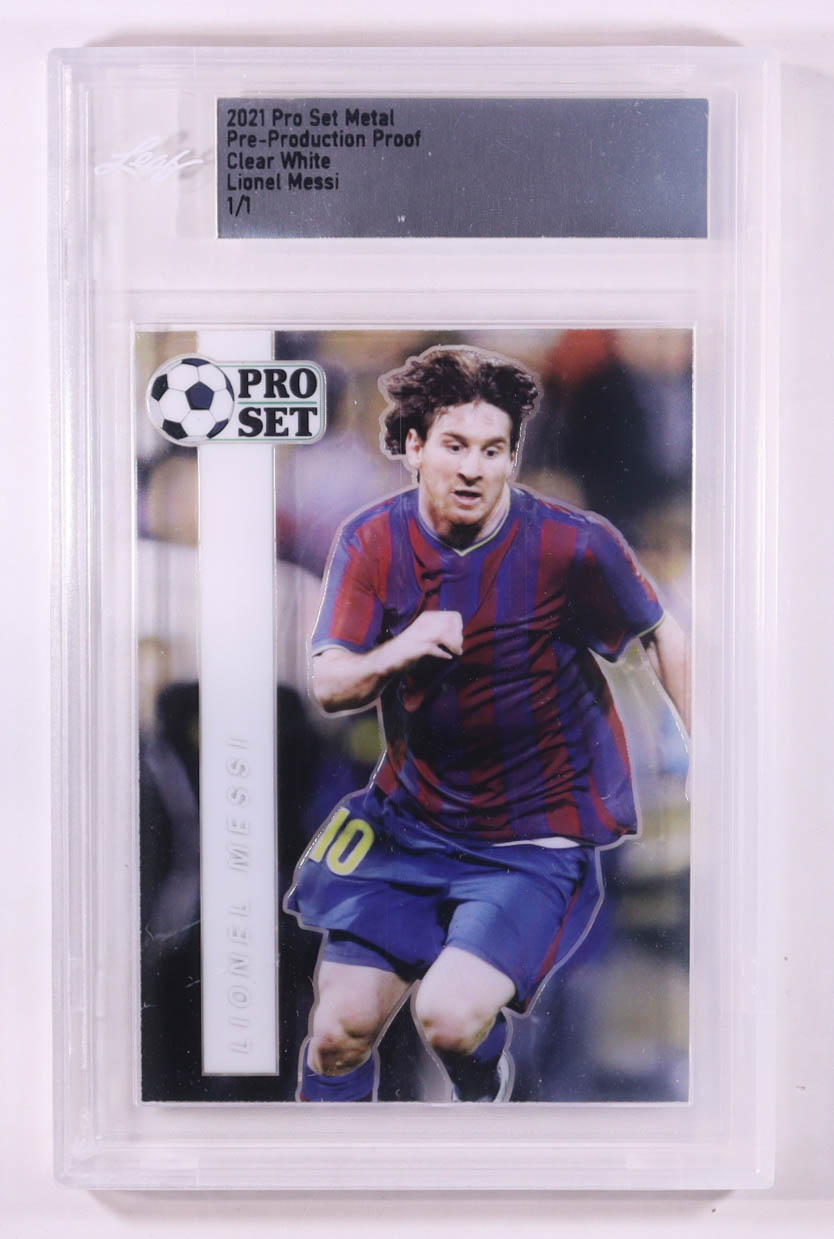 Lionel Messi 2021 Pro Set Metal Pre-Production Proof Clear White #NNO 1/1 (Leaf)