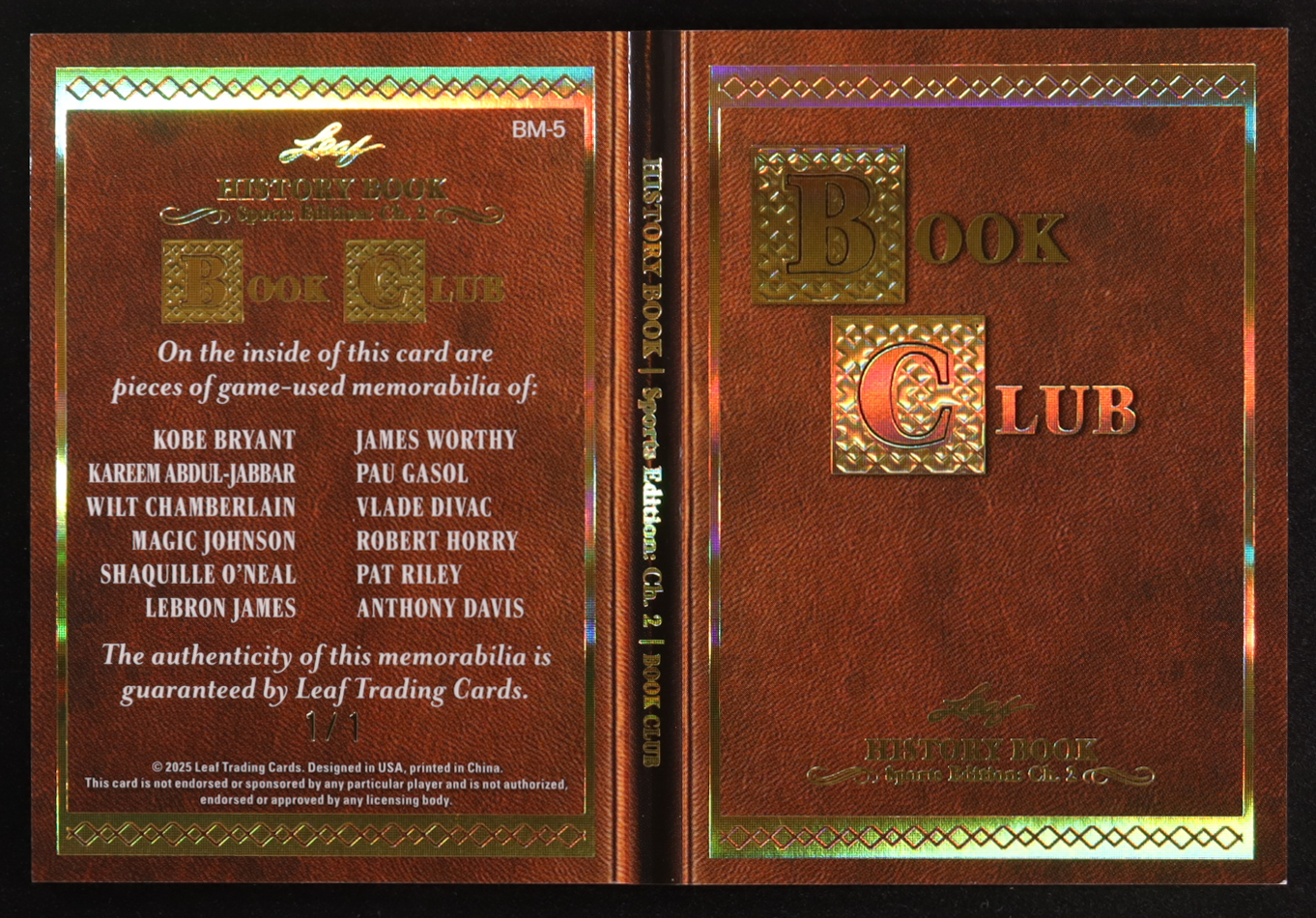 2025 Leaf History Book Book Club Gold #BM-5 #1/1 Kobe Bryant/Kareem Abdul-Jabbar/Wilt Chamberlain/Magic Johnson/Shaquille O'Neal/LeBronJames/James Worthy/Pau Gasol/Vlade Divac/Robert Horry/Pat Riley/Anthony Davis