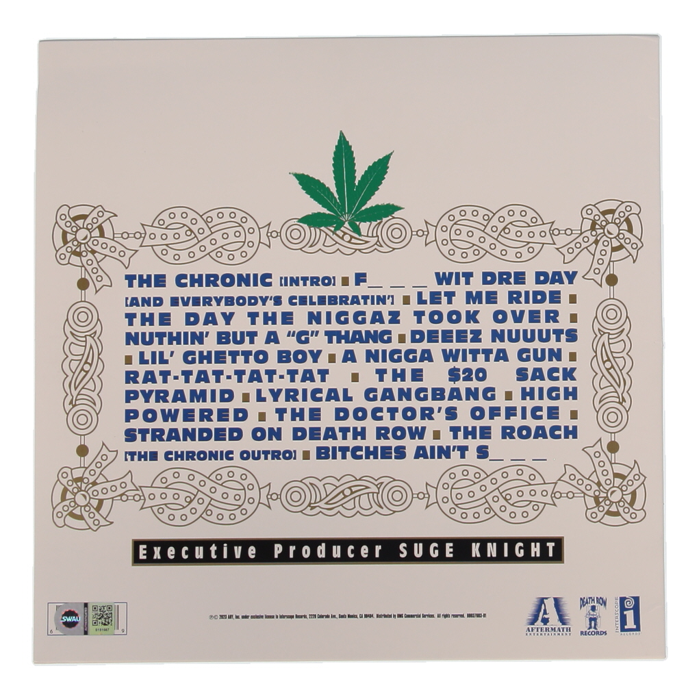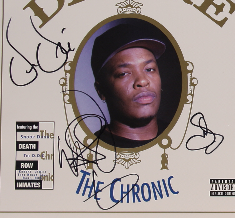 "The Chronic" vinyl record album cover has been hand-signed by Dr. Dre, Snoop Dogg, and G Warren. Please note, the vinyl record is included as shown.