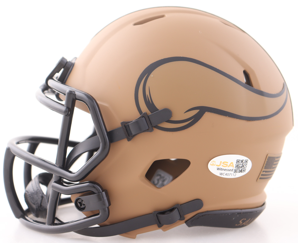 Riddell Minnesota Vikings Salute to Service Alternate speed mini helmet. Hand-signed by Jordan Addison.