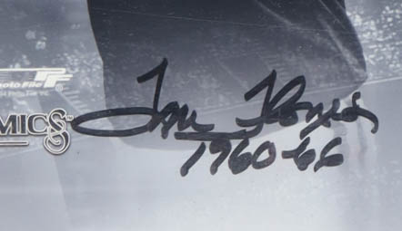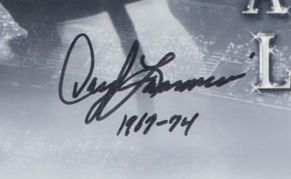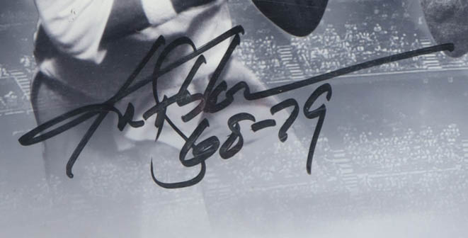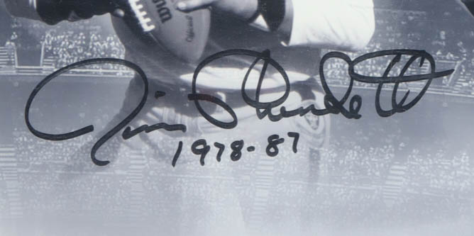 Art print measures 12" x 36" in size and has been hand-signed and inscribed by (5) with George Blanda (D. 2010, Oakland Raiders, HOF), Tom Flores (Oakland Raiders, HOF), Ken Stabler (D. 2015, Oakland Raiders, HOF), Jim Plunkett (Oakland Raiders) and Daryle Lamonica (D. 2022, Oakland Raiders).