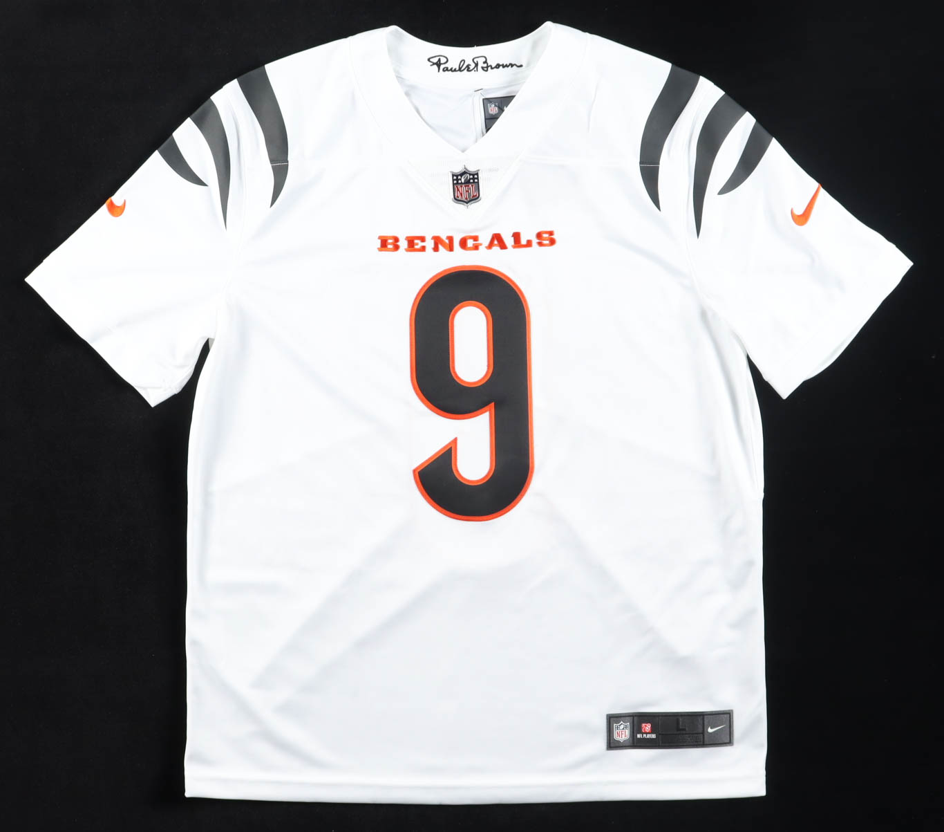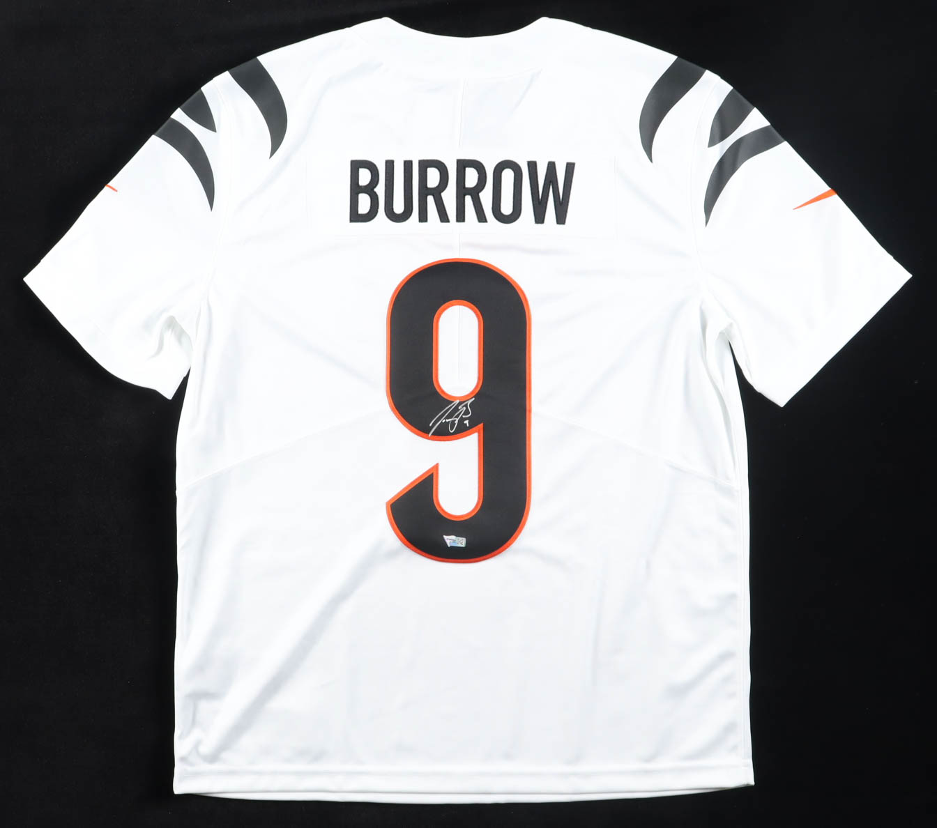 Nike jersey with everything sewn on, size L. Hand-signed by Joe Burrow (Cincinnati Bengals).