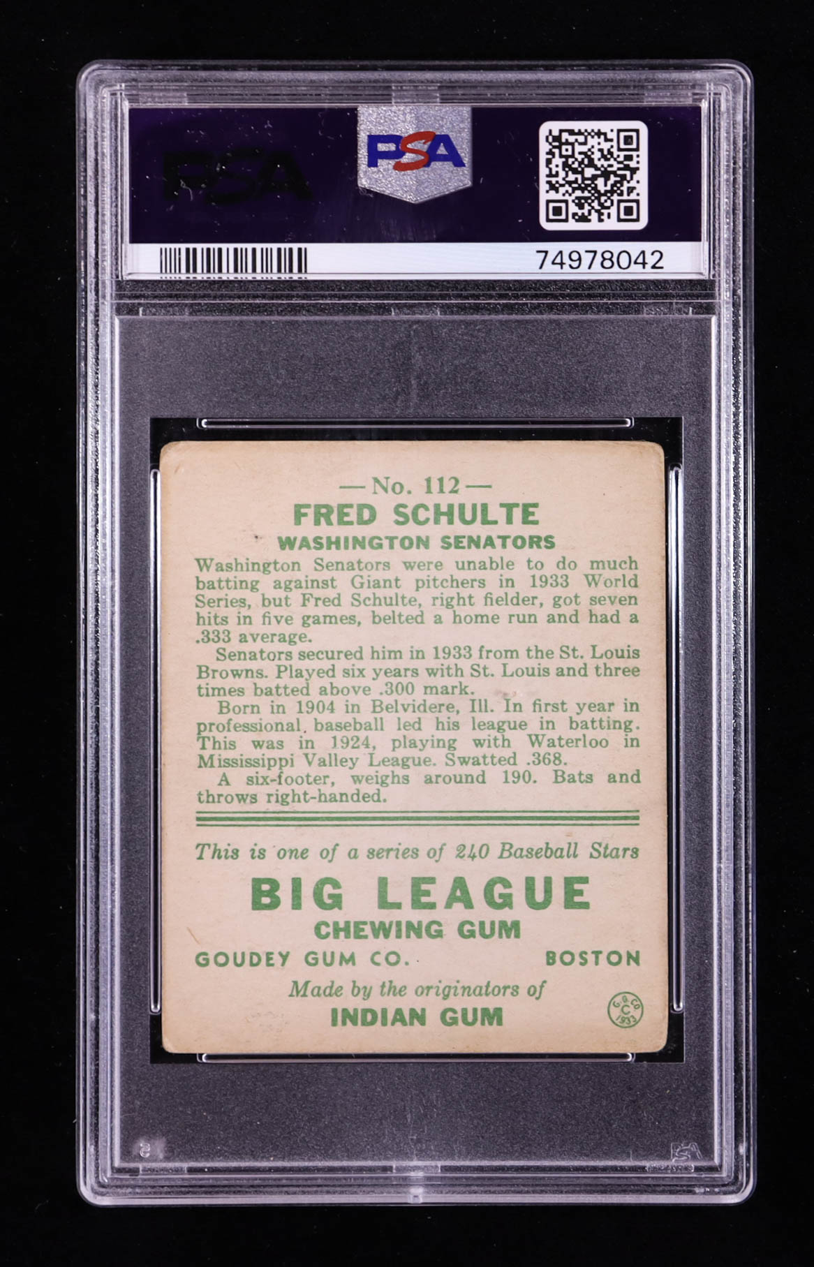 Fred Schulte 1933 Goudey #112 RC (PSA 2)