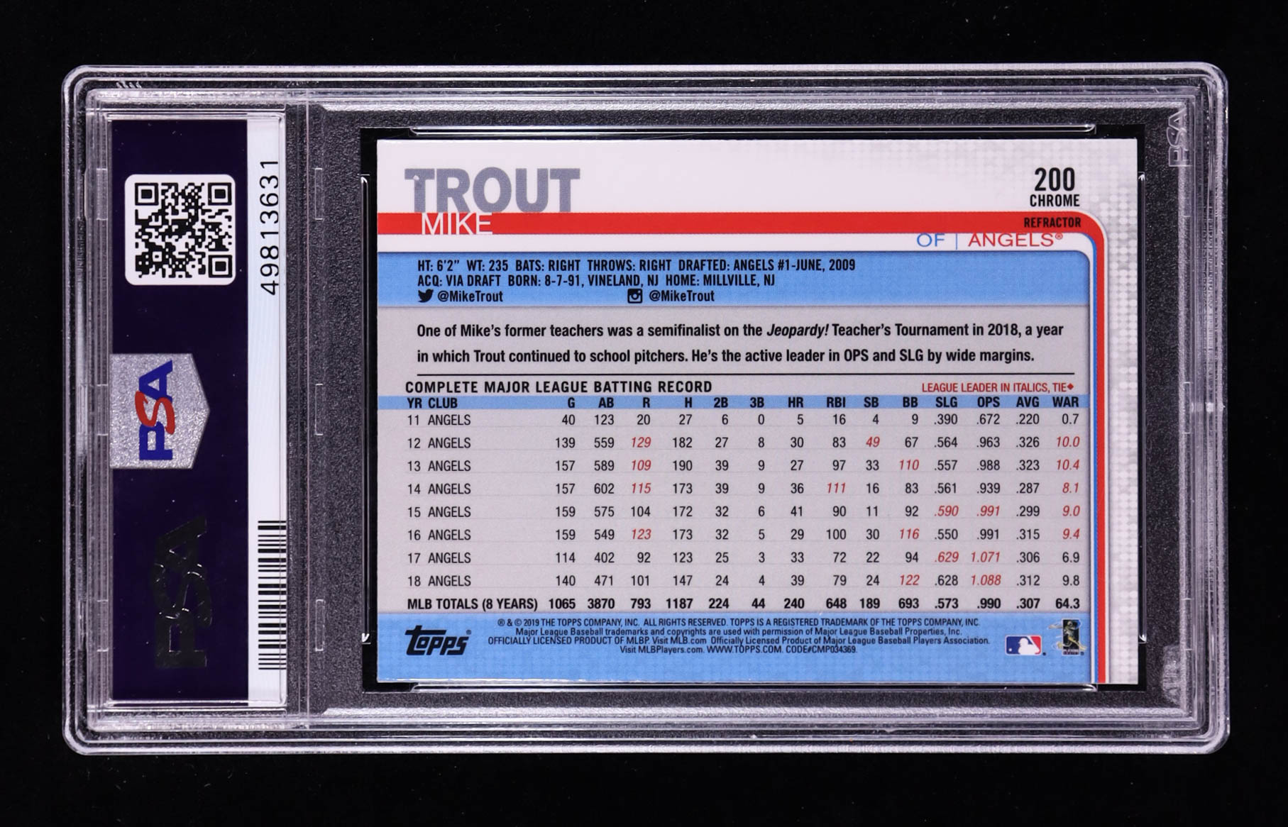 Mike Trout 2019 Topps Chrome Pink Refractors #200 (PSA 10)
