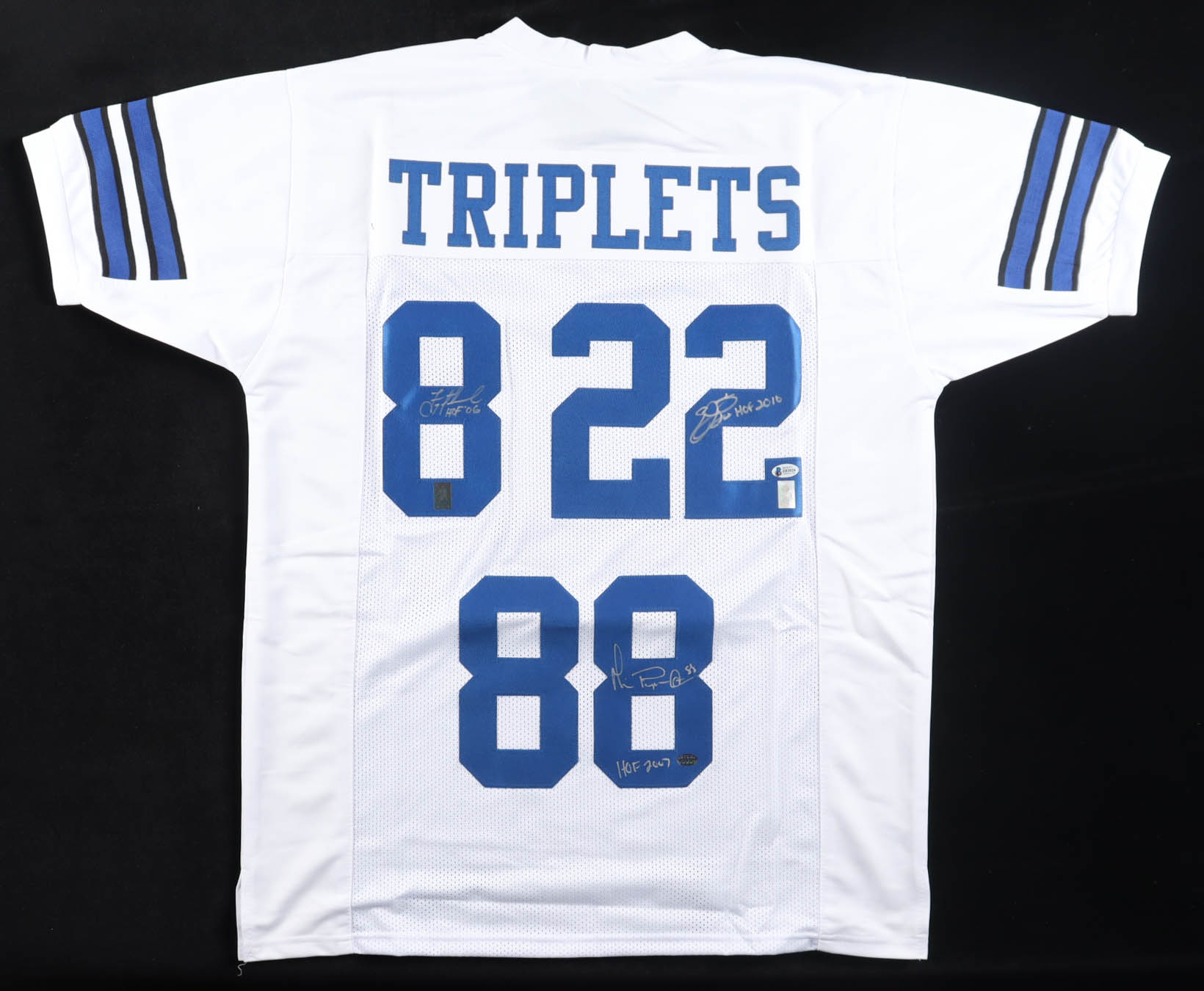 Troy Aikman, Michael Irvin & Emmitt Smith Signed "Triplets" Jersey With HOF Inscriptions (Beckett, Irvin, Smith, Aikman)