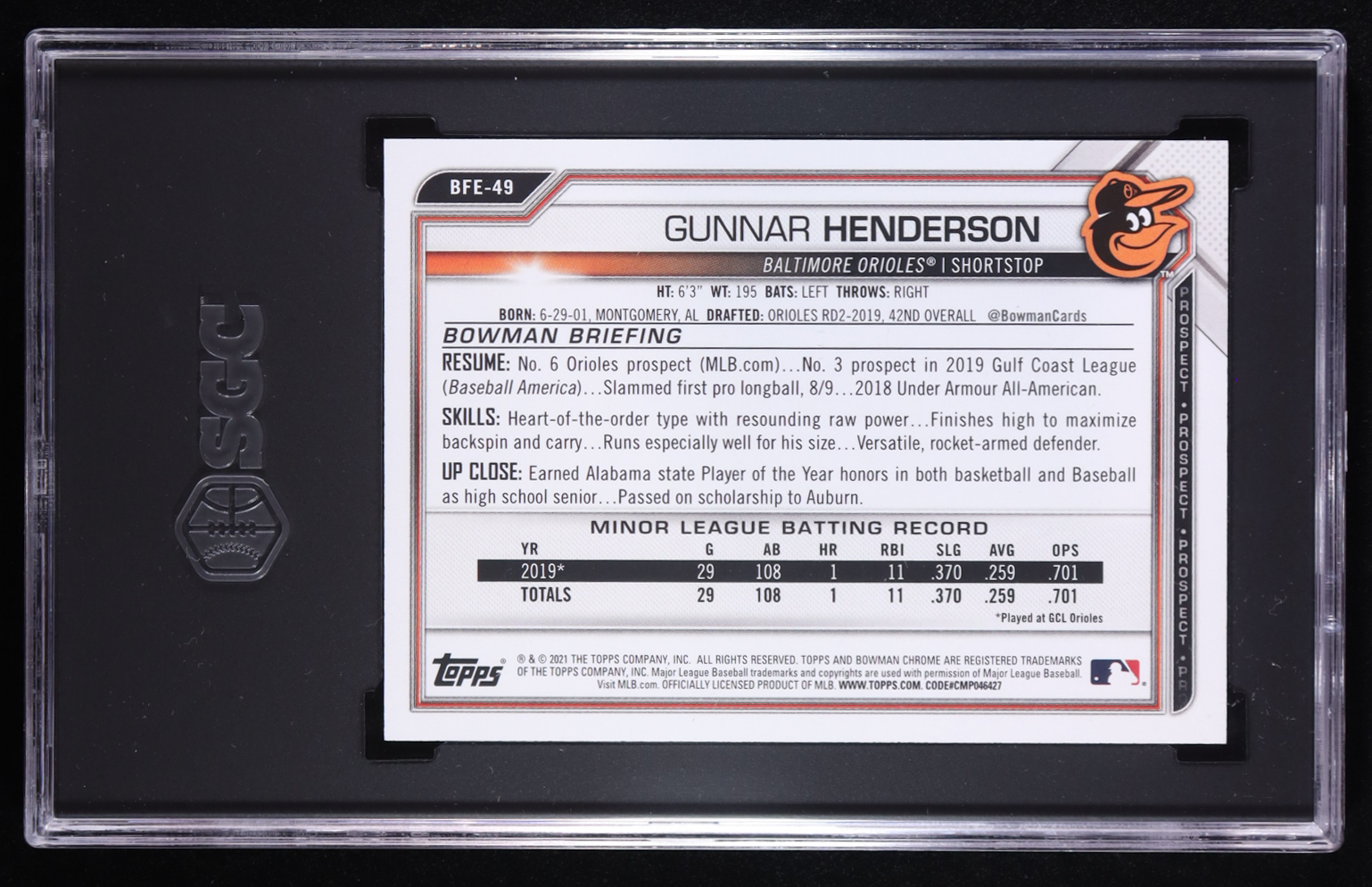 Gunnar Henderson 2021 Bowman First Edition Sky Blue Foil #BFE-49 RC (SGC 9.5)