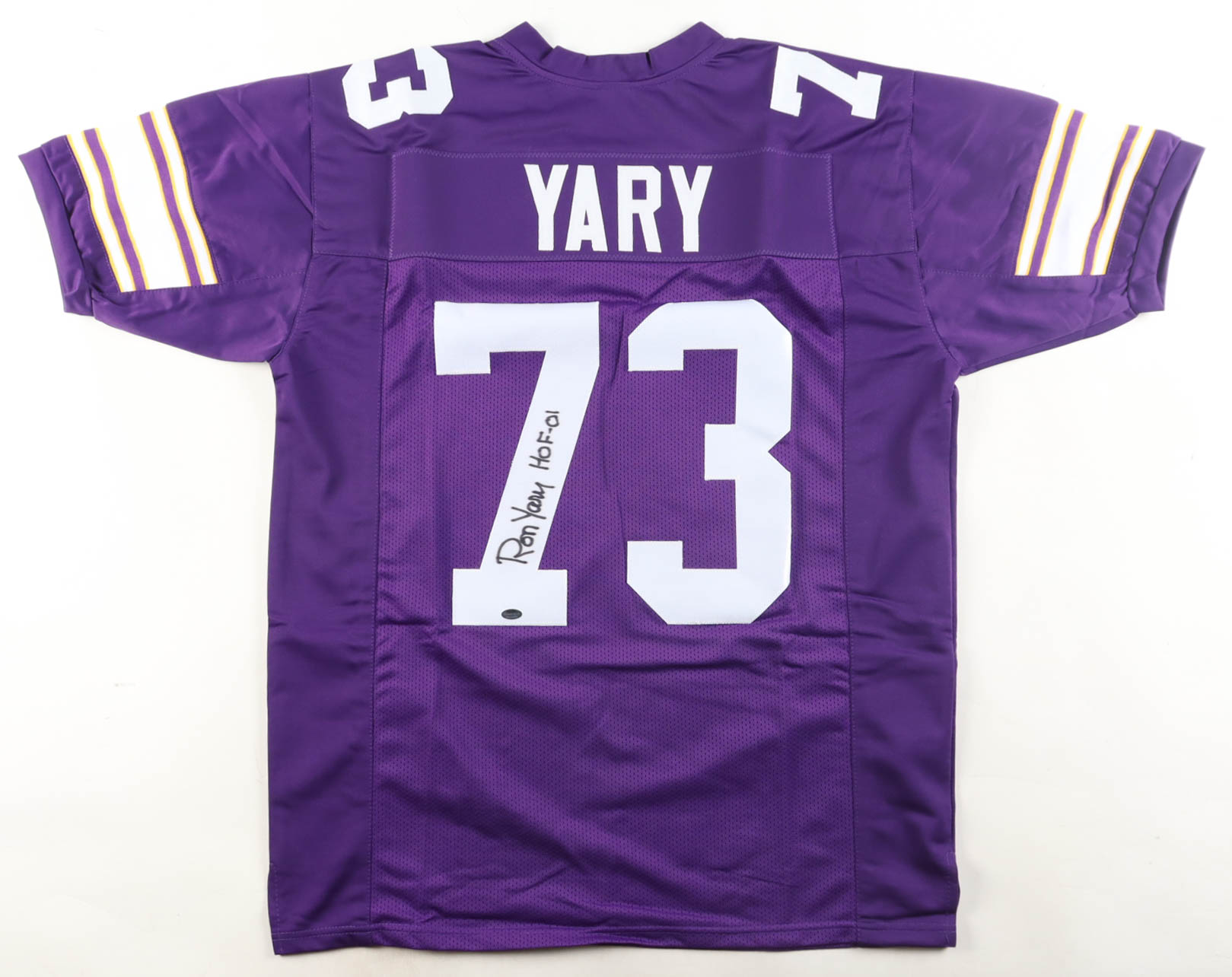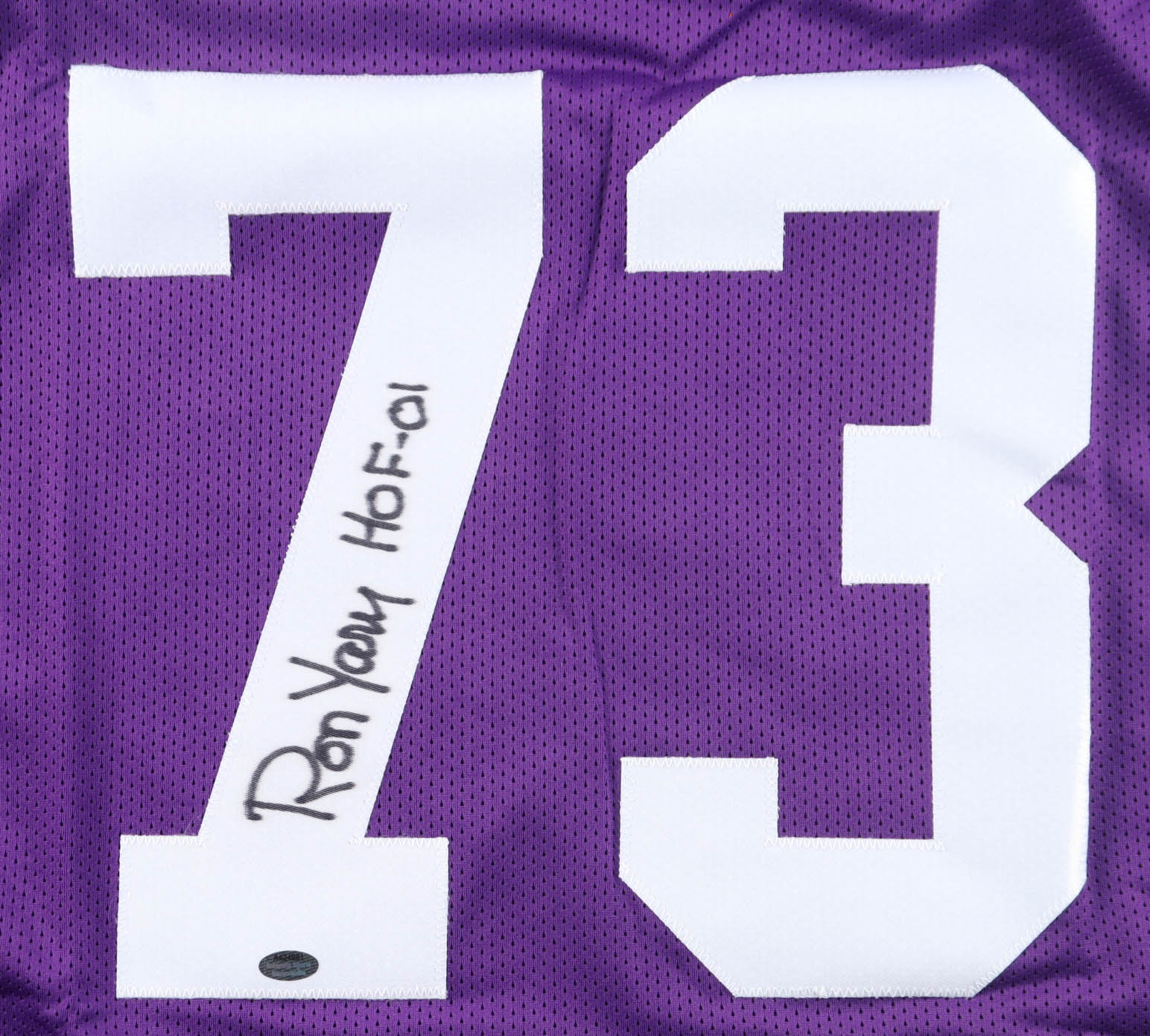Custom jersey with everything sewn on, size XL. Hand-signed and inscribed by Ron Yary (HOF).
