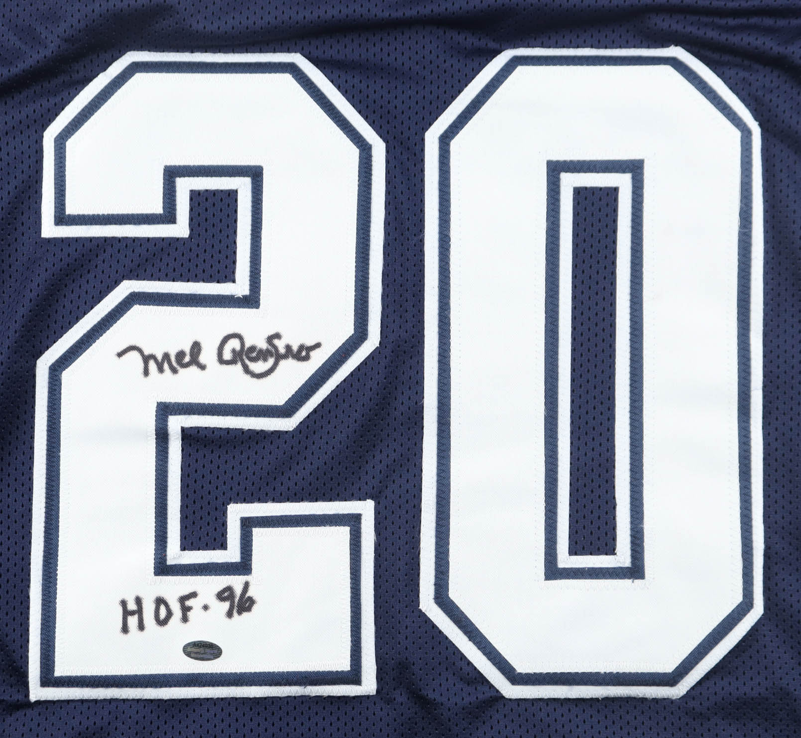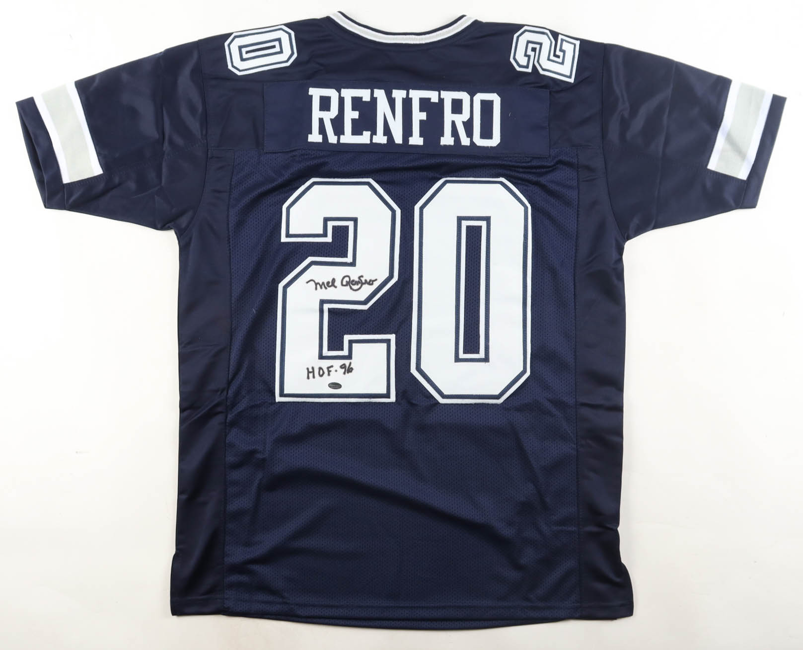 Custom jersey with everything sewn on size XL. Hand-signed and inscribed by Mel Renfro (HOF). Please note, the signature and inscription has bled. See photos regarding the condition of the item.
