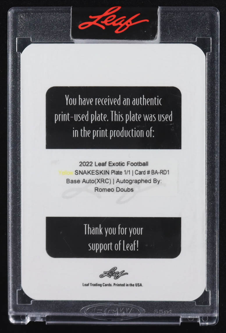 Romeo Doubs 2022 Leaf Exotic Football Snakeskin Yellow Print Production Plate Signatures #BARD1 #1/1 RC