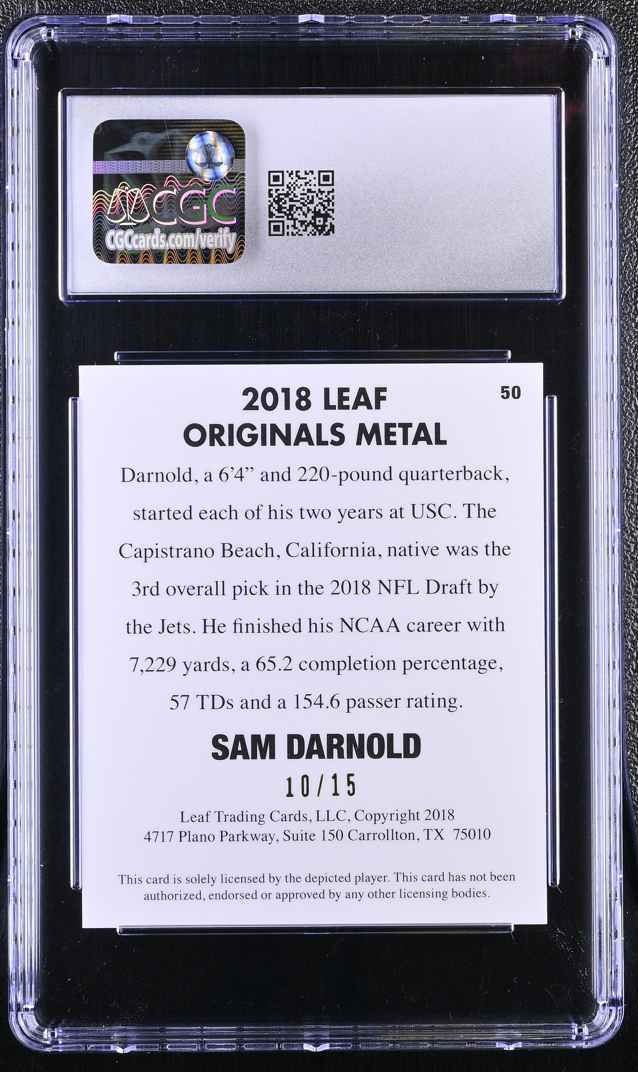 Sam Darnold 2018 Leaf Originals Metal '48 Purple #50 RC #10/15 (CGC 9)