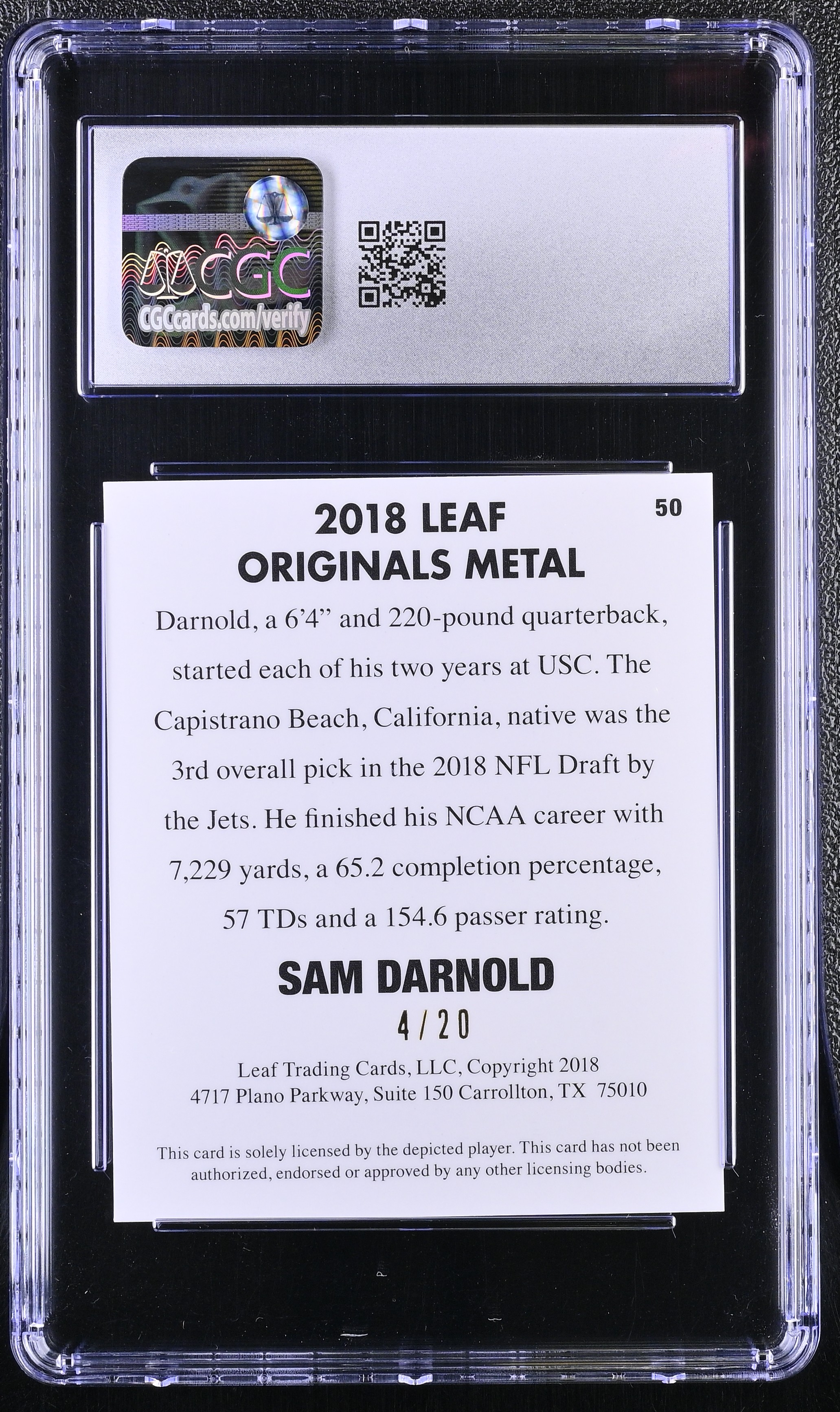 Sam Darnold 2018 Leaf Originals Metal '48 Blue #50 RC #4/20 (CGC 9)