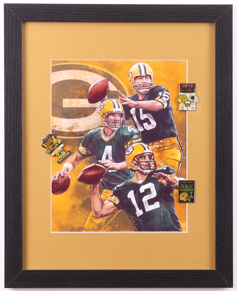 Bart Starr, Brett Farve, & Aaron Rodgers Packers Custom Framed Art Print Display with (3) Super Bowl Pins