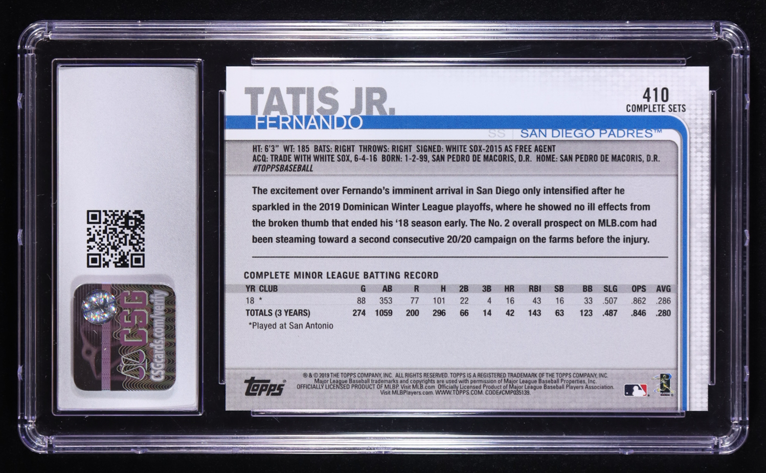 Fernando Tatis Jr. 2019 Topps Complete Sets #410 RC (CSG 9.5)