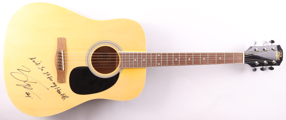 Rogue acoustic guitar measures 42" long. Hand-signed and inscribed on the base by Zach Top.