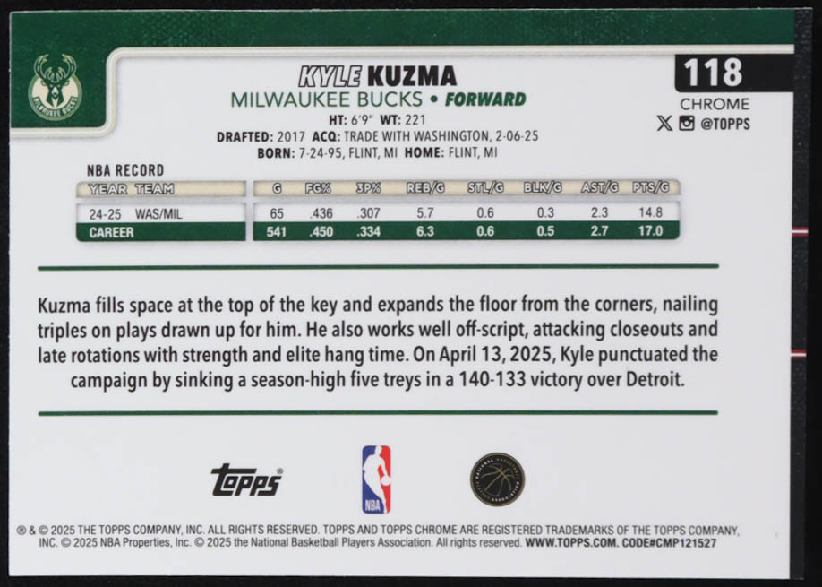 Kyle Kuzma 2025-26 Topps Chrome RayWave Refractors #118