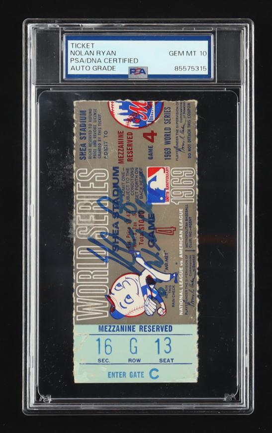 1969 Original World Series Game ticket has been hand-signed and inscribed by Nolan Ryan (New York Mets, HOF) and graded (PSA Gem MT 10). Please see photos for details regarding the item.