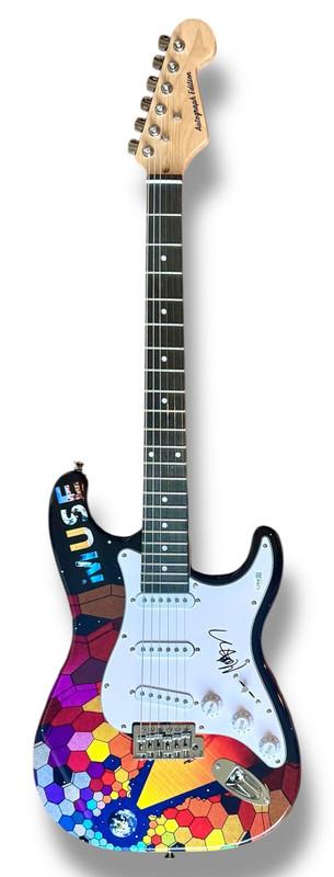 Custom Autograph Edition Muse Stratocaster style electric guitar measures approximately 39" in length and has been hand-signed on the pickguard by Matt Bellamy.