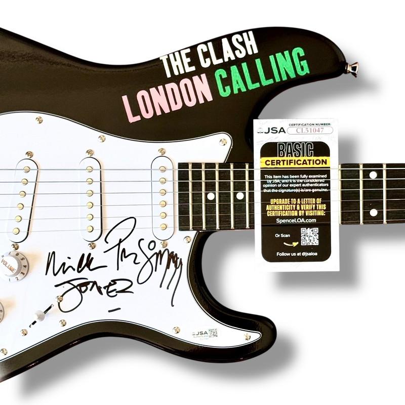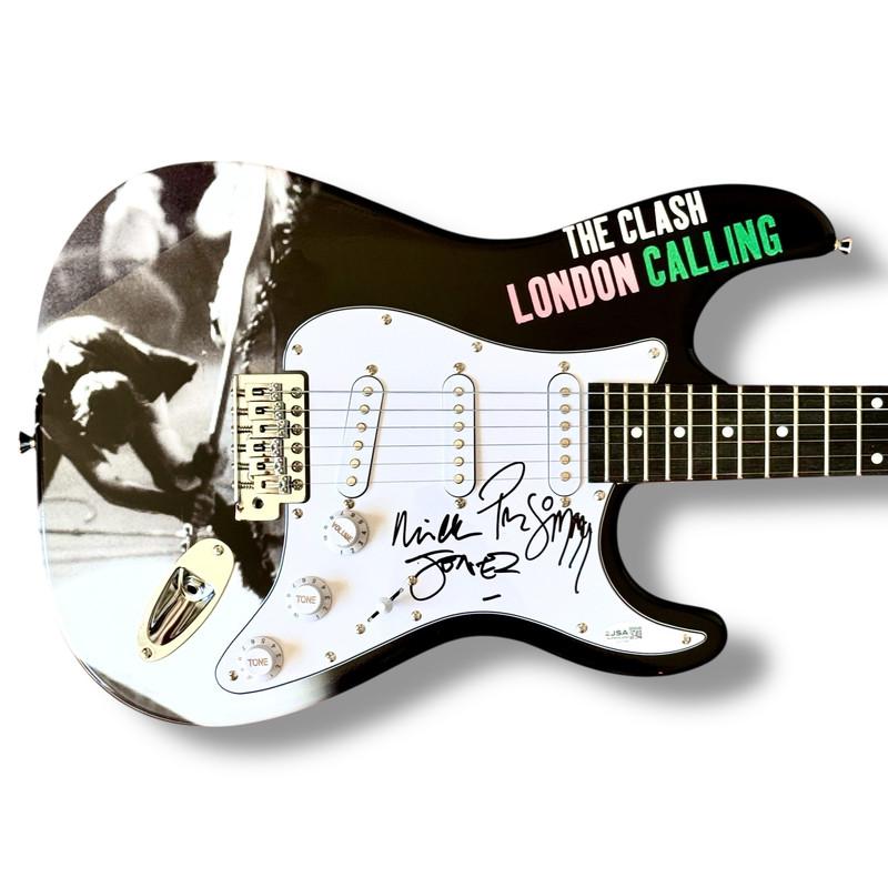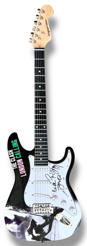 Custom Autograph Edition Stratocaster style electric guitar measures approximately 39" in length and has been hand-signed on the pickguard by Mick Jones (lead guitarist) and Paul Simonon (lead bassist).