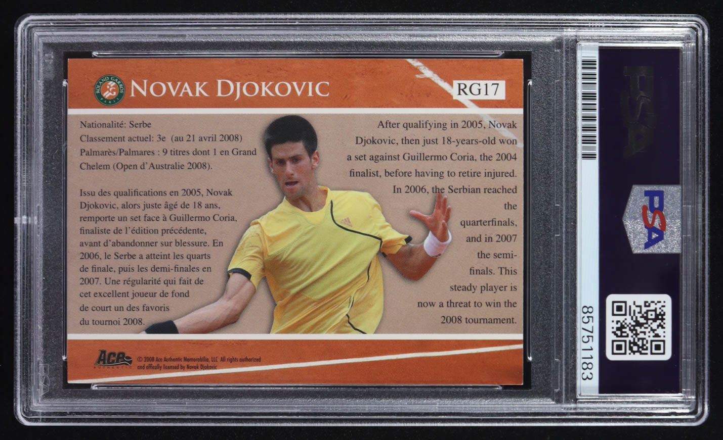 Novak Djokovic Signed 2008 Ace Authentic Roland Garros Paris #RG17 (PSA)