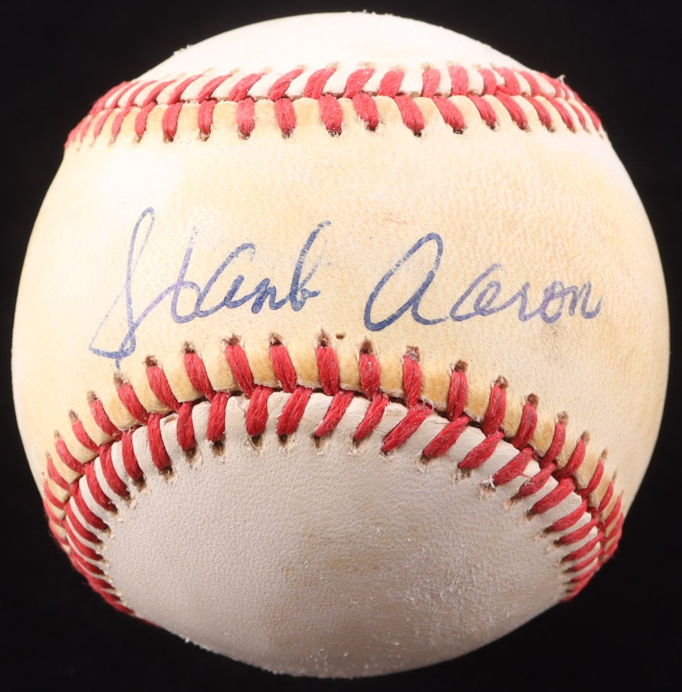 Rawlings Official National League Baseball. Hand-signed by Hank Aaron (D. 2021, Milwaukee Brewers, HOF). Please note, ball has been naturally stained toned. Refer to photos regarding the condition of the item.