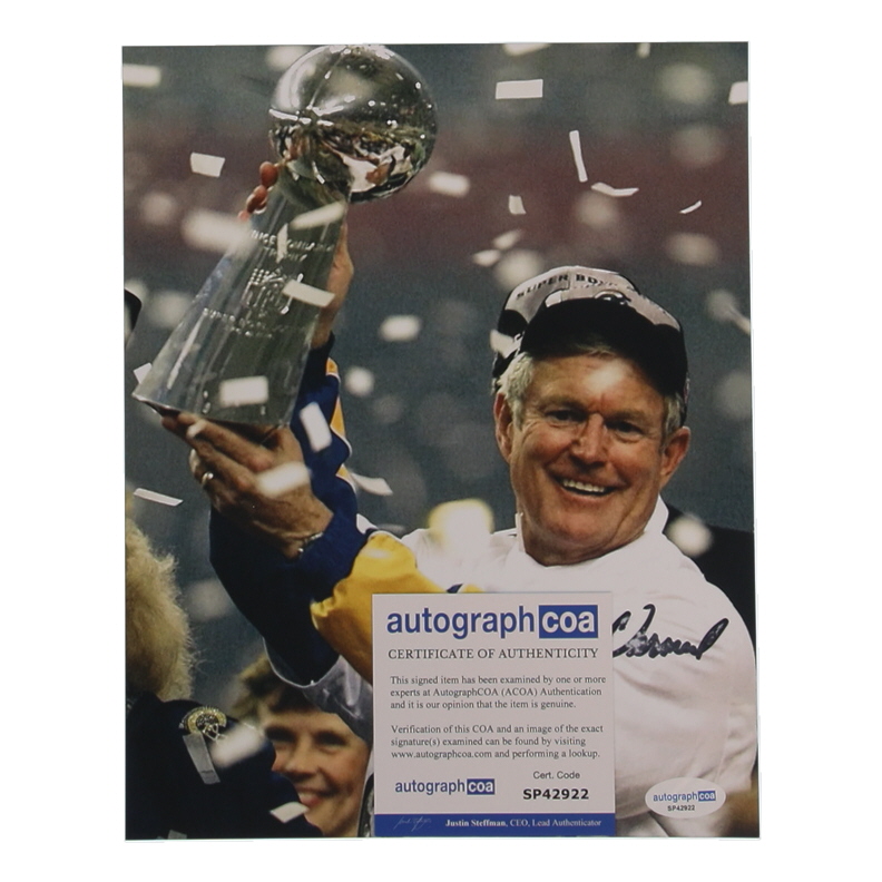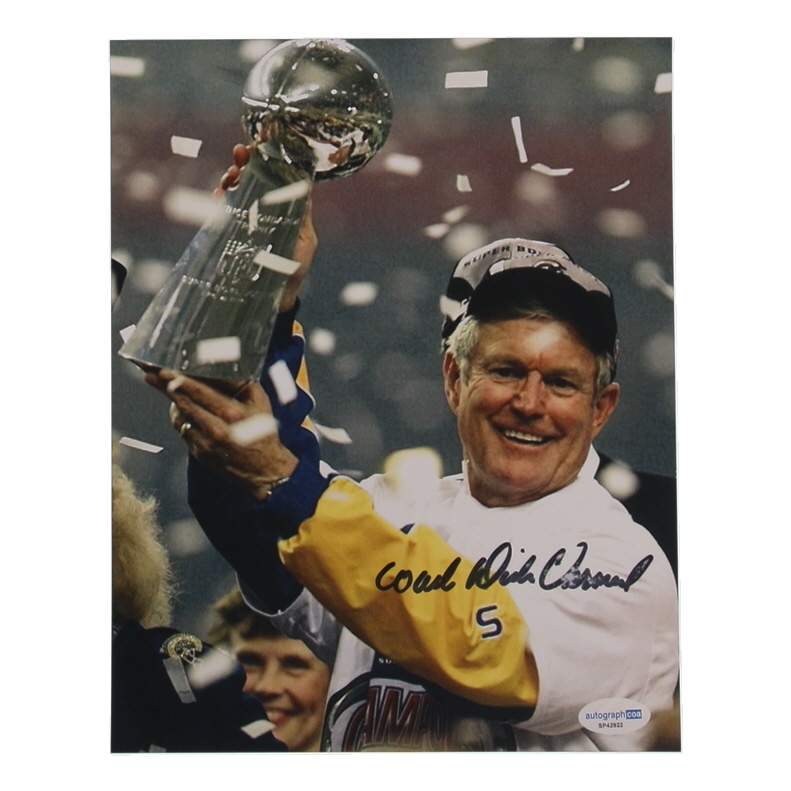 Photo measures 8" x 10" in size and has been hand-signed and inscribed by Dick Vermeil (St. Louis Rams, HOF). Please note, the signature is scuffed.