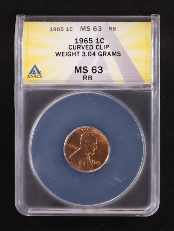 1965 Lincoln Memorial 1C Cent, Mint Error: Curved Clip 3.04 Grams (ANACS MS63 RB)