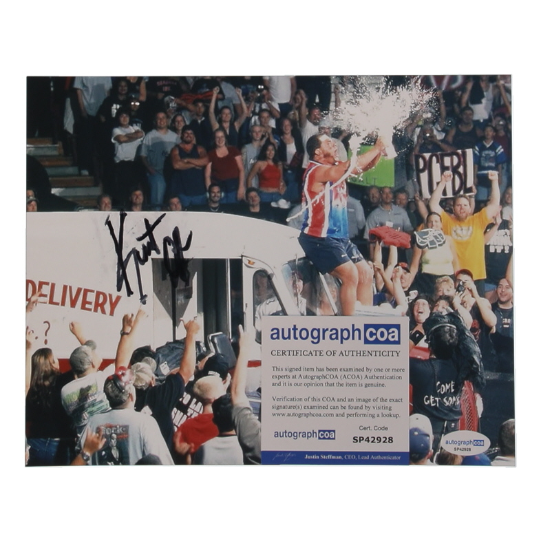 Photo measures 8" x 10" in size and has been hand-signed by Kurt Angle (HOF). Please note, the signature is smudged.