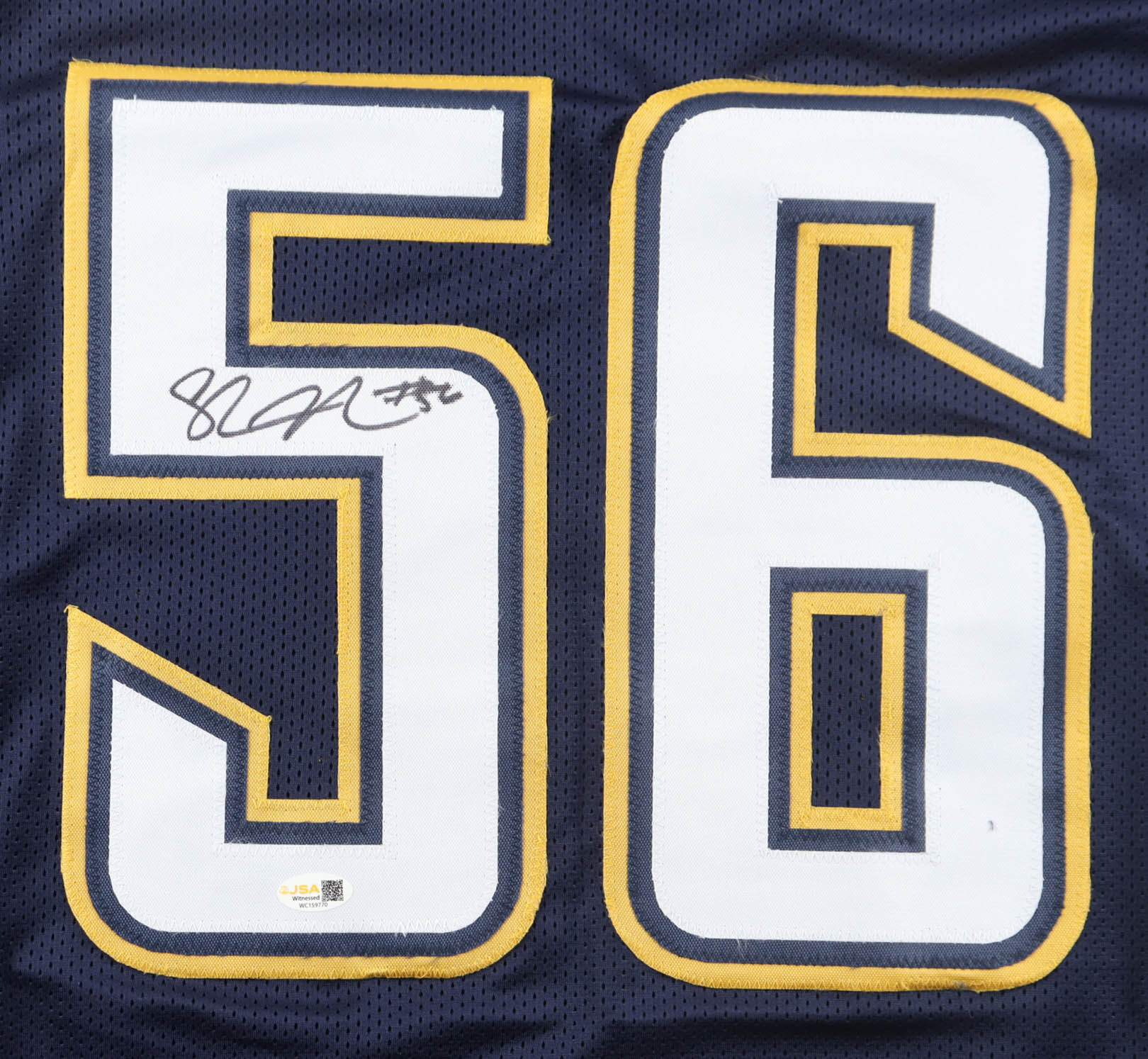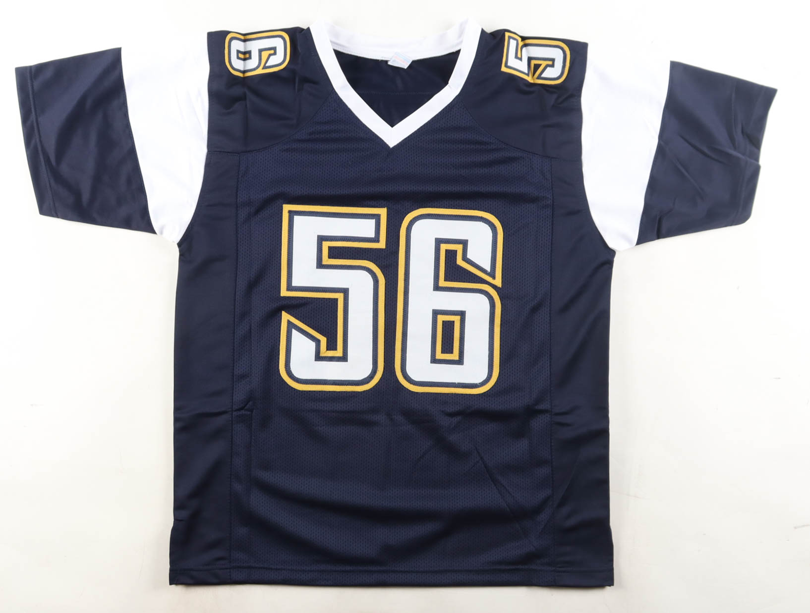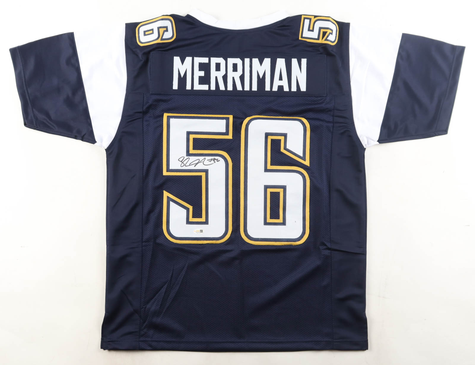 Custom jersey with everything sewn on, size XL. Hand-signed by Shawne Merriman.